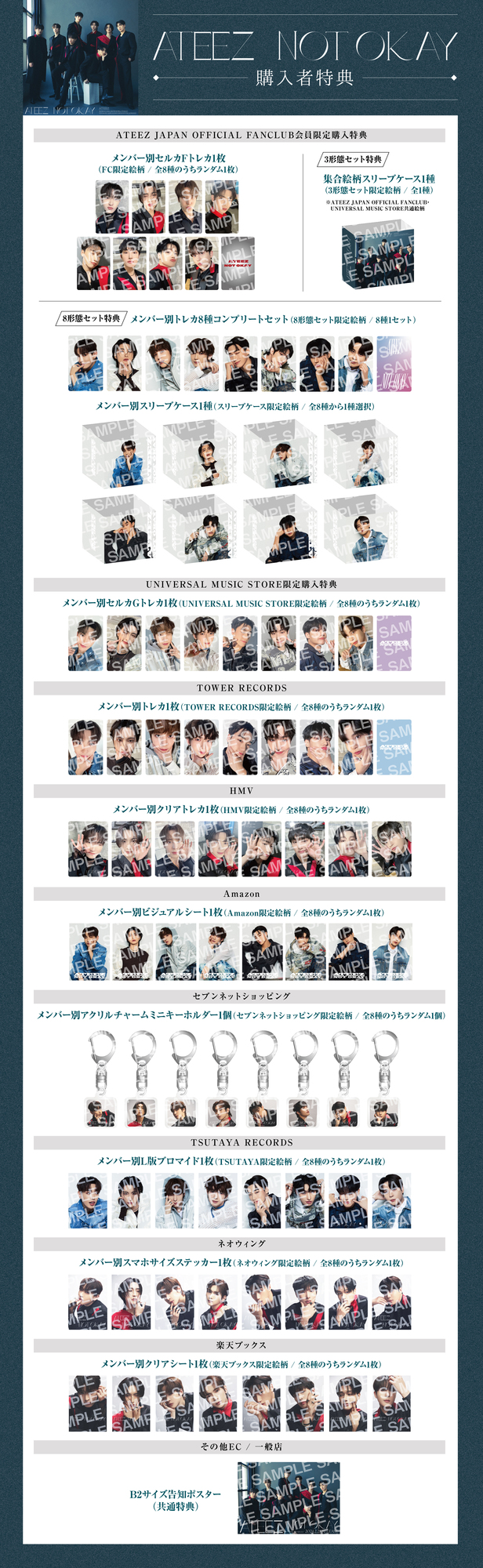 以下の対象店舗でATEEZ JAPAN 3RD SINGLE「NOT OKAY」をご予約・ご購入いただきますと、先着で特典をプレゼントいたします。